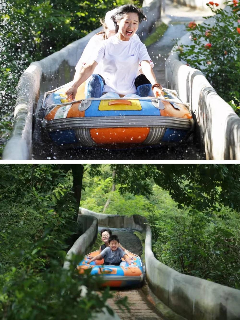 滑道全長1088米,宛如一條長龍,依山勢蜿蜒而下,總落差近400米?;婪秩?,首段處極峰之巔,可覽漫山盛景;中段陡峭驚險,可享急速體驗;末段九曲盤旋,可浴幽谷清風。