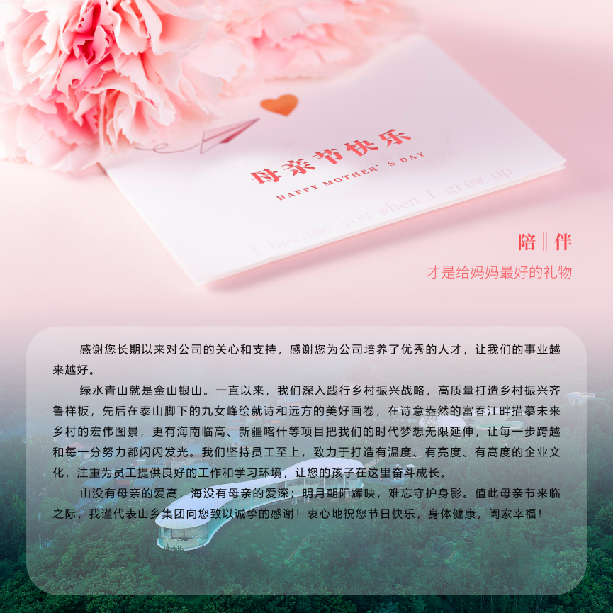 濃情五月,感恩母愛。母親節(jié)來臨之際,山鄉(xiāng)集團(tuán)有限公司(簡稱“山鄉(xiāng)集團(tuán)”)工會組織“以愛之名·感恩有您”活動致愛母親節(jié)。工會為員工母親寄送康乃馨花束,山東文旅集團(tuán)首席戰(zhàn)略官,山鄉(xiāng)集團(tuán)黨委書記、董事長張建峰致信每一位員工的母親表達(dá)節(jié)日祝福。