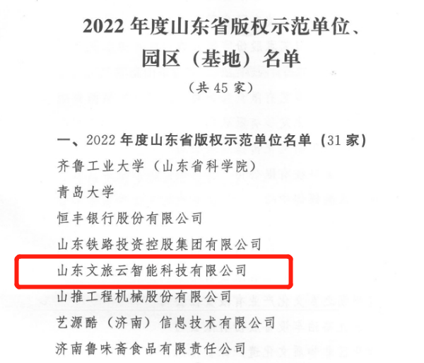 近日,山東省版權(quán)局公布2022年度山東省版權(quán)示范單位、園區(qū)(基地)名單,山東文旅云智能科技有限公司(簡稱“文旅云公司”)入選“山東省版權(quán)示范單位”。