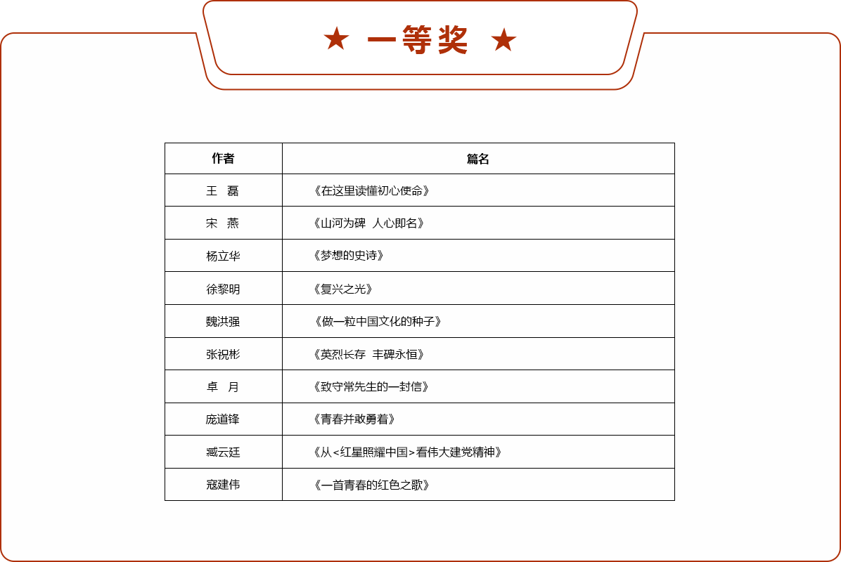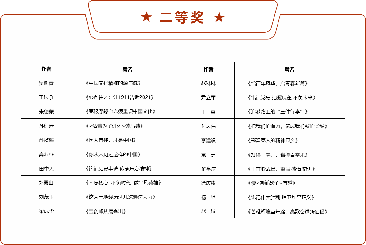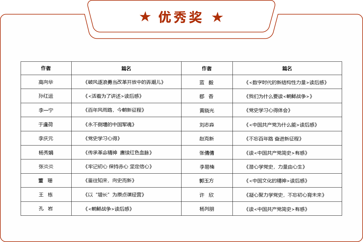 2021年是中國共產(chǎn)黨成立100周年,集團(tuán)黨委黨史學(xué)習(xí)教育領(lǐng)導(dǎo)小組辦公室在全集團(tuán)范圍內(nèi)組織開展了“牢記初心  保持赤心  堅(jiān)定信心”黨史學(xué)習(xí)讀書競賽活動(dòng)。經(jīng)初評(píng)、復(fù)評(píng)及終審三輪評(píng)審,審定100篇獲獎(jiǎng)作品,其中一等獎(jiǎng)10名、二等獎(jiǎng)20名、三等獎(jiǎng)30名、優(yōu)秀獎(jiǎng)40名,共有3家單位榮獲優(yōu)秀組織獎(jiǎng)。2022年9月22日在濟(jì)南舉行頒獎(jiǎng)典禮。