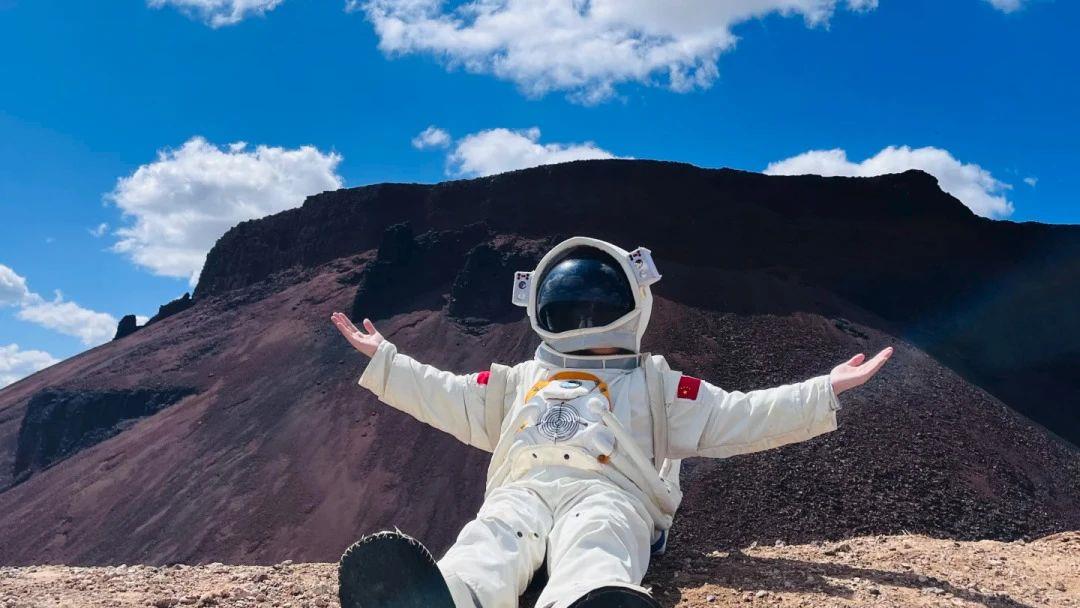 在8號火山腳下的草原緩坡低頭尋覓,運氣好能邂逅瑪瑙碎塊?;鹕缴仙⒉贾抡婵铸埬P?。站在霸王龍投下的陰影里,拍一張“侏羅紀畢業(yè)紀念”?;鹕饺蹘r堵塞河道形成的堰塞湖,碧水倒映著火山錐影。沿湖散步,原本畢業(yè)季分別的悲傷,也被稀釋了許多。6號火山(南煉丹爐)是必打卡之地,這里有獨特的黑色玄武巖地表,寸草不生,宛如月球表面。穿上純白的宇航服,手持五星紅旗,站在灰黑色的火山巖上,隨手一拍就是科幻感十足的“火星大片”。難怪網(wǎng)友笑稱:“地上的宇航員比天上的還多!”