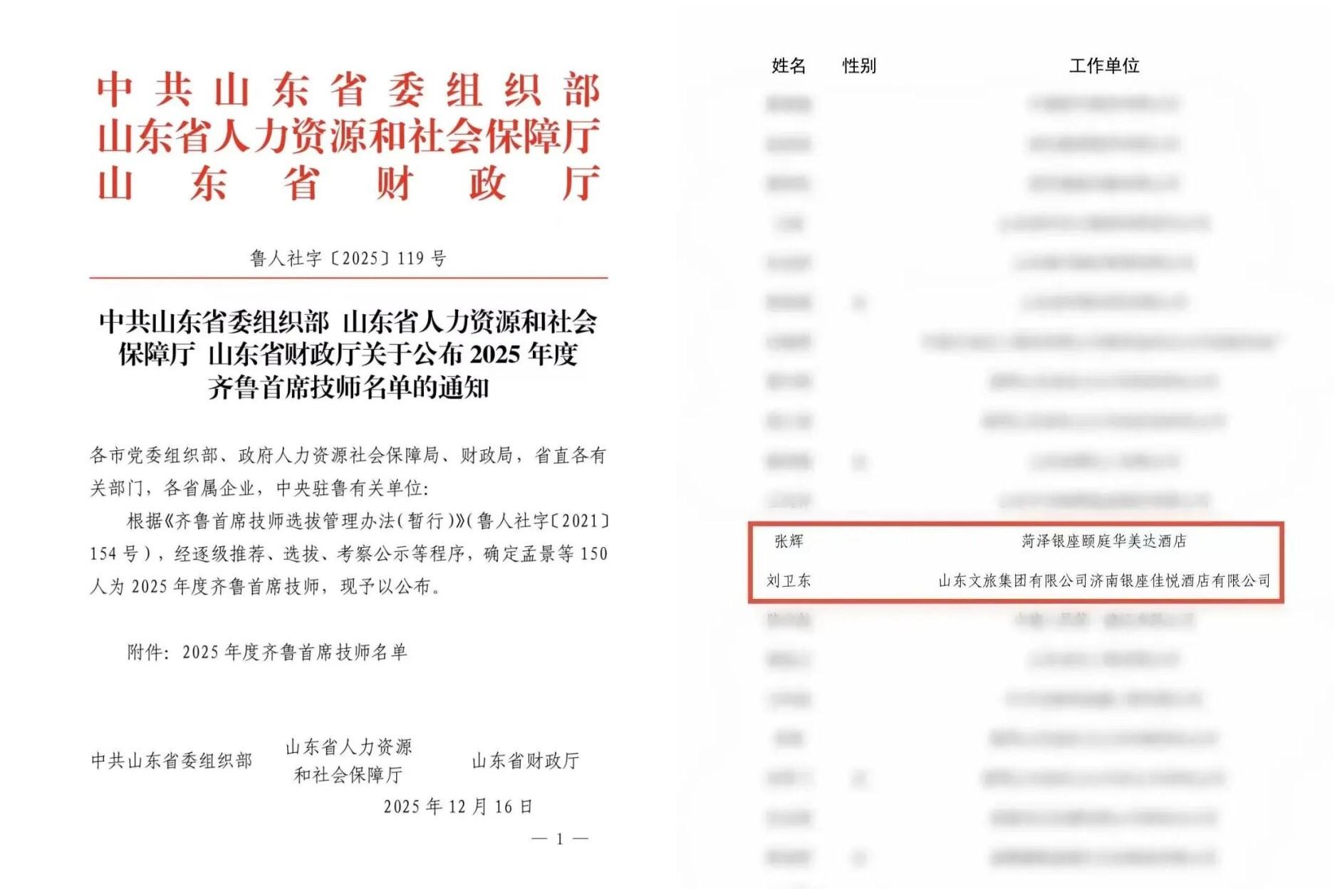 高技能人才是企業(yè)發(fā)展的核心動能,公司在人才培育領(lǐng)域的成果再獲官方認(rèn)可。在中共山東省委組織部、省人力資源和社會保障廳、省財政廳公布的2025年度齊魯首席技師名單中,濟南佳悅酒店劉衛(wèi)東、菏澤頤庭華美達(dá)酒店張輝成功入選。作為山東省技能人才領(lǐng)域的官方榮譽,此次入選不僅是對個人專業(yè)技能的肯定,更印證了公司人才培養(yǎng)體系的成熟高效。截至目前,山東文旅酒店集團(tuán)已累計培育齊魯首席技師6名,高技能人才隊伍建設(shè)持續(xù)走深走實。
