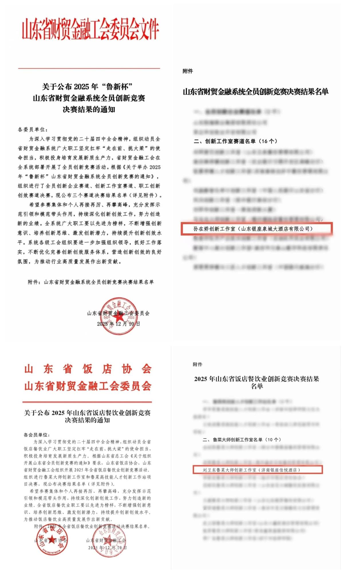 在山東省財貿(mào)金融工會公布的2025年“魯新杯”山東省財貿(mào)金融系統(tǒng)全員創(chuàng)新競賽決賽結(jié)果通知中,泉城大酒店“孫在嬌創(chuàng)新工作室”躋身創(chuàng)新工作室賽道獲獎名單;在山東省飯店協(xié)會、山東省財貿(mào)金融工會組織開展的2025年山東省飯店餐飲業(yè)創(chuàng)新競賽決賽中,濟南佳悅酒店“劉衛(wèi)東魯菜大師創(chuàng)新工作室”入選魯菜大師創(chuàng)新工作室名單。