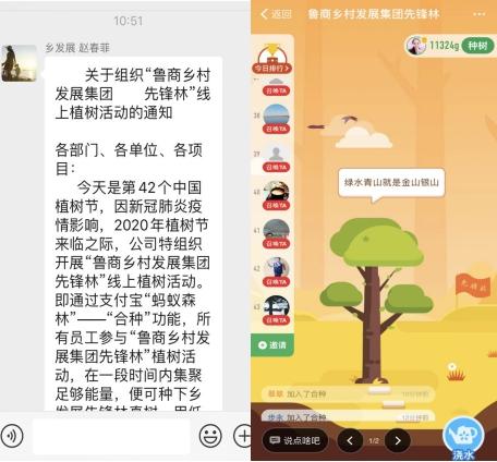 線上植樹,線下收獲。公司借助支付寶“螞蟻森林”線上公益平臺(tái),發(fā)起合種了虛擬的“魯商鄉(xiāng)村發(fā)展集團(tuán)先鋒林”,動(dòng)員全體黨員干部職工通過(guò)綠色出行、網(wǎng)絡(luò)購(gòu)票、電子發(fā)票、綠色辦公、線上繳費(fèi)、綠色政務(wù)等日常低碳行為,收集、澆灌綠色能量,在手機(jī)上“澆水種樹”,助力先鋒林順利成長(zhǎng)。之后螞蟻森林會(huì)在合適的時(shí)間,在線下以公司的名義,種下對(duì)應(yīng)能量數(shù)值的真樹,并發(fā)放電子合種證書。當(dāng)前,“手機(jī)種樹”不僅成為全社會(huì)“共同的事情”,還被認(rèn)可為公民法定植樹義務(wù)的盡責(zé)形式之一。