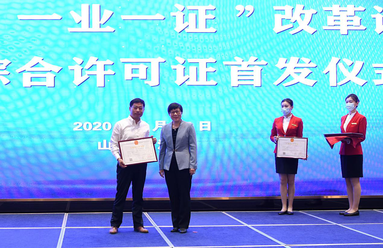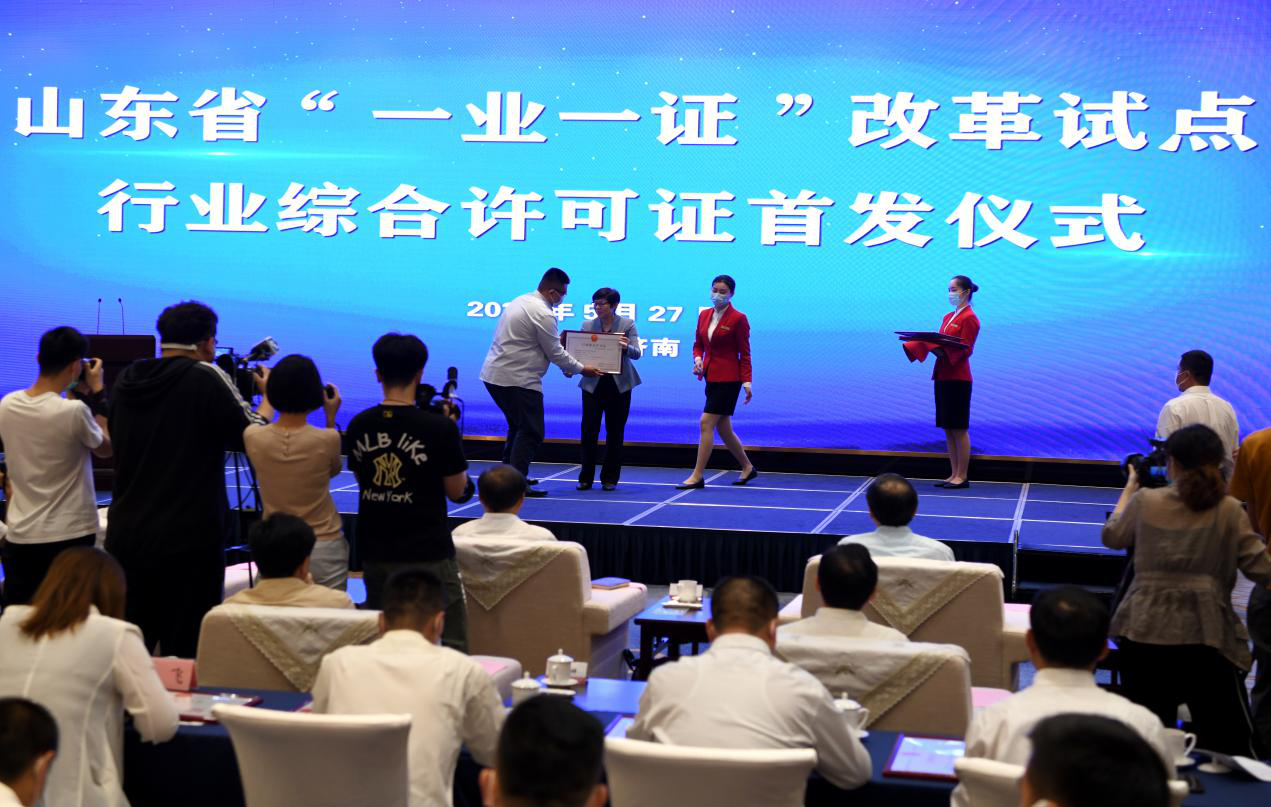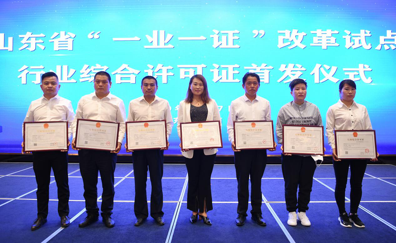 5月27日,山東省“一業(yè)一證”改革試點行業(yè)綜合許可證首證頒發(fā)儀式在濟南舉行。山東省副省長任愛榮向20個行業(yè)頒發(fā)了行業(yè)綜合許可證,魯商九女峰(泰安)鄉(xiāng)村振興有限公司總經(jīng)理于在武第一個上臺領(lǐng)取許可證。山東首次頒發(fā)行政綜合許可證標志著我省“一業(yè)一證”改革邁出了重要的一步,將最大限度減材料、簡環(huán)節(jié)、壓時限,讓企業(yè)群眾少跑腿、不跑腿,是我省深化商事制度改革,破解“準入不準營”難題,實現(xiàn)“一窗受理·一次辦好”的重大改革舉措。山東省委常委劉強出席儀式并致辭。