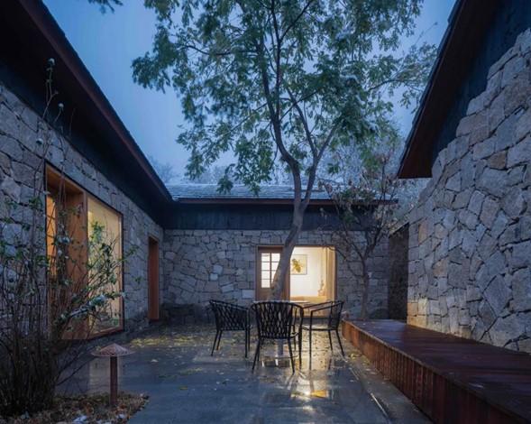 整體的民宿院落保留了石墻的主題,有些有意識(shí)地復(fù)原了殘?jiān)珨啾诘钠?。相?duì)輕盈的屋頂結(jié)構(gòu),與平臺(tái)一樣,仿佛從厚重遠(yuǎn)久的墻體里生長(zhǎng)出來的新生命。原本方案設(shè)計(jì)的一些裝飾性線條,在項(xiàng)目進(jìn)行的過程當(dāng)中被簡(jiǎn)化舍棄了,我們更想表達(dá)出北方院落的清爽與果斷。
