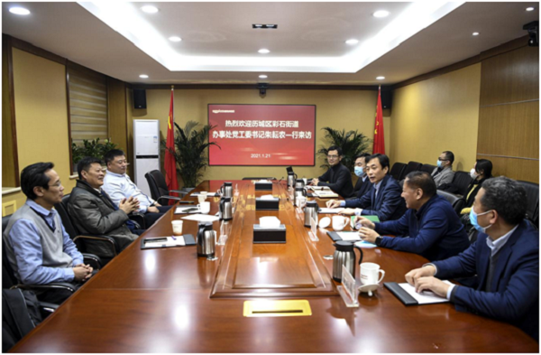 1月21日,歷城區(qū)彩石街道辦事處黨工委書記朱耘農一行到訪魯商鄉(xiāng)村發(fā)展集團(簡稱鄉(xiāng)發(fā)展)。鄉(xiāng)發(fā)展董事長張建峰、總經理曲勇與來賓會談交流。