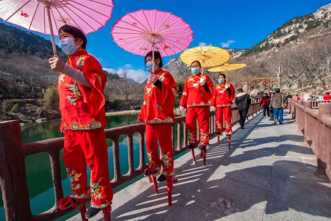 大年初一至初五,天蒙山景區(qū)每天進(jìn)行熱鬧的舞龍舞獅、踩高蹺、扭秧歌、山羊馬戲等民俗巡游表演,游客和沂蒙老鄉(xiāng)現(xiàn)場(chǎng)互動(dòng),攤煎餅、編柳編、剪紙,玩的不亦樂乎。
