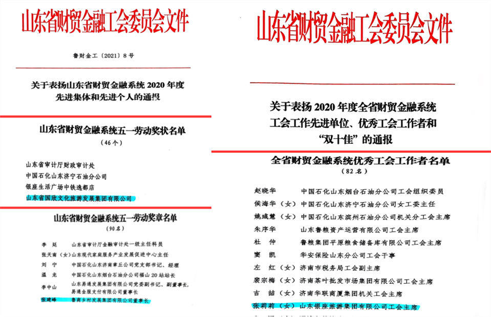 3月31日,山東省財貿金融工會一屆三次委員會議在濟南召開,國欣文旅在表彰中榮獲“山東省財貿金融系統(tǒng)五一勞動獎狀”,鄉(xiāng)發(fā)展集團董事長張建峰榮獲“山東省財貿金融系統(tǒng)五一勞動獎章”,文旅酒店集團工會主席張莉莉榮獲“2020年度全省財貿金融系統(tǒng)優(yōu)秀工會工作者”。