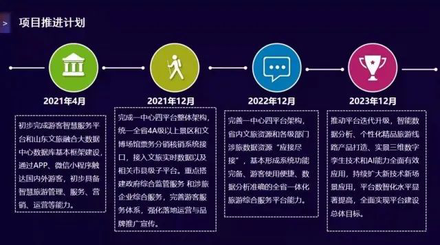 根據(jù)整體規(guī)劃,“好客山東 云游齊魯”智慧文旅項目將分三年建設完成。今年4月底前,初步完成游客智慧服務平臺和山東智慧文旅融合大數(shù)據(jù)中心數(shù)據(jù)庫基本框架建設,通過微信小程序、公眾號觸達國內(nèi)外游客;12月底前,完成“一中心四平臺”整體架構,統(tǒng)一全省4A級以上景區(qū)和博物館票務分銷核銷系統(tǒng)接口;2022年12月底前,山東省內(nèi)文旅資源和各級各部門涉旅數(shù)據(jù)資源“應接盡接”;2023年12月底前,推動平臺功能迭代升級,擴大新技術場景應用,全面實現(xiàn)平臺建設總體目標。