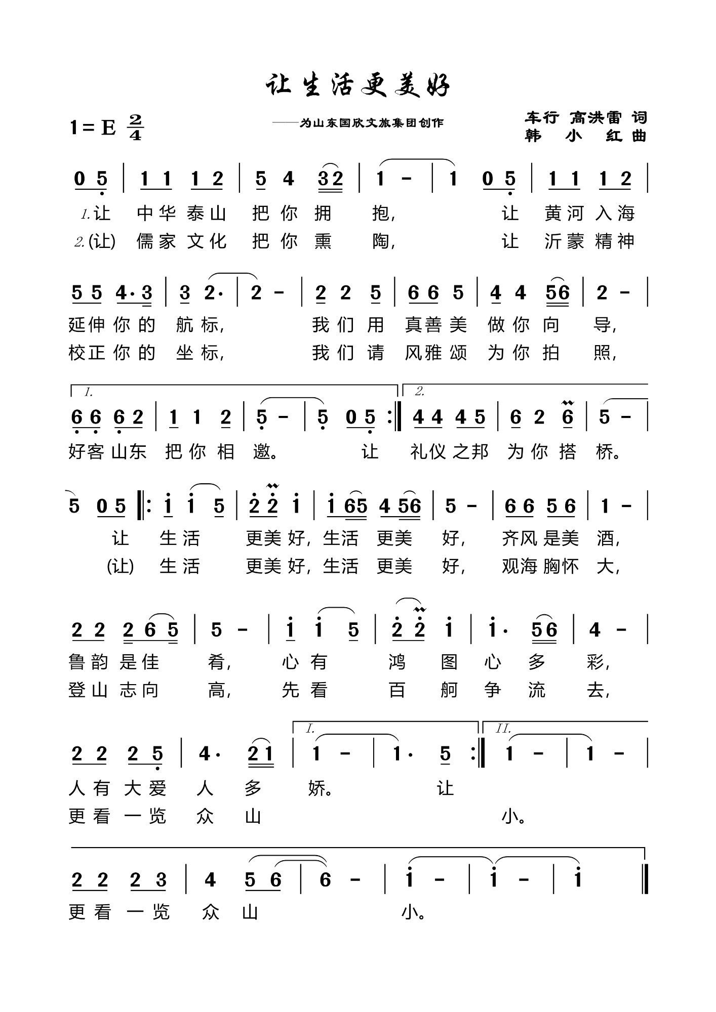 《讓生活更美好》是由國欣文旅攜手一線藝術(shù)創(chuàng)作團(tuán)隊共同打造的一首悅耳動聽的抒情歌曲,由空軍政治部文工團(tuán)創(chuàng)作室主任、中國音樂文學(xué)學(xué)會副主席車行,魯商集團(tuán)黨委書記、董事長兼國欣文旅黨委書記、董事長高洪雷作詞,青年作曲家韓小紅作曲。