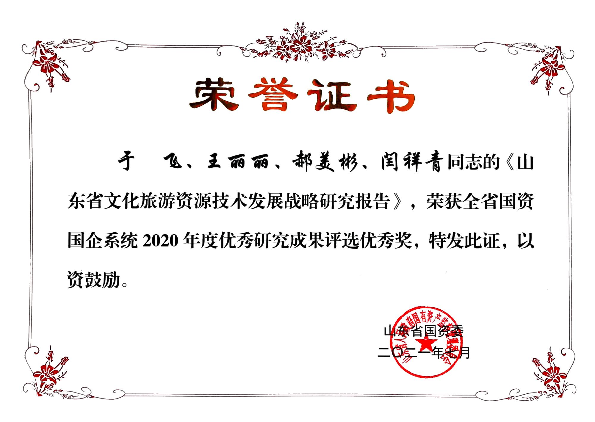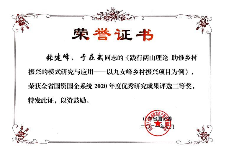 日前,山東省國資委公布了全省國資國企系統(tǒng)2020年度優(yōu)秀研究成果評選結(jié)果。國欣文旅的《踐行兩山理論 助推鄉(xiāng)村振興的模式研究與應(yīng)用——以九女峰鄉(xiāng)村振興項目為例》(作者張建峰、于在武)與《山東省文化旅游資源技術(shù)發(fā)展戰(zhàn)略研究報告》(作者于飛、王麗麗、郝美彬、閆祥青)兩項成果分別榮獲二等獎及優(yōu)秀獎。