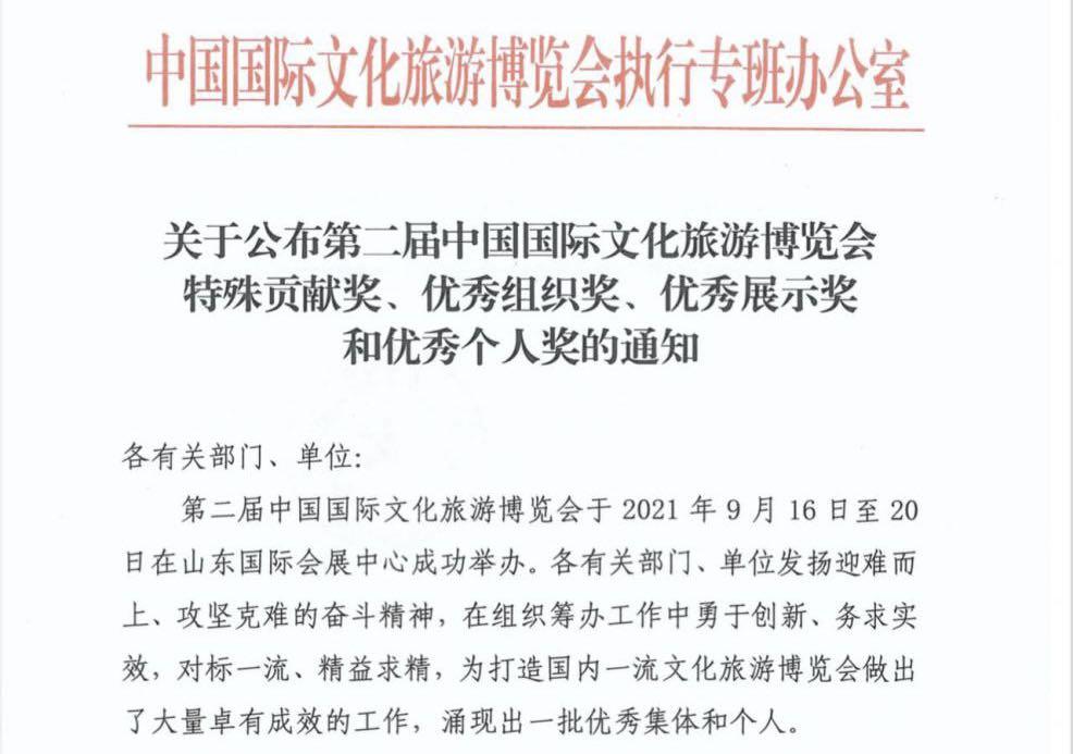 為表彰優(yōu)秀,鼓勵(lì)創(chuàng)新,日前,中國(guó)國(guó)際文化旅游博覽會(huì)執(zhí)行專(zhuān)班下發(fā)《關(guān)于公布第二屆中國(guó)國(guó)際文化旅游博覽會(huì)特殊貢獻(xiàn)獎(jiǎng)、優(yōu)秀組織獎(jiǎng)、優(yōu)秀展示獎(jiǎng)和優(yōu)秀個(gè)人獎(jiǎng)的通知》。其中,國(guó)欣文旅榮獲“優(yōu)秀組織獎(jiǎng)”和“優(yōu)秀展示獎(jiǎng)”雙榮譽(yù),旗下山東文旅酒店集團(tuán)、山東文旅傳媒集團(tuán)、《山東商報(bào)》社榮獲“優(yōu)秀組織獎(jiǎng)”,山東文旅魯菜館精品魯菜展榮獲“優(yōu)秀展示獎(jiǎng)”,《山東商報(bào)》社總經(jīng)理劉茂玉榮獲“優(yōu)秀個(gè)人獎(jiǎng)”。