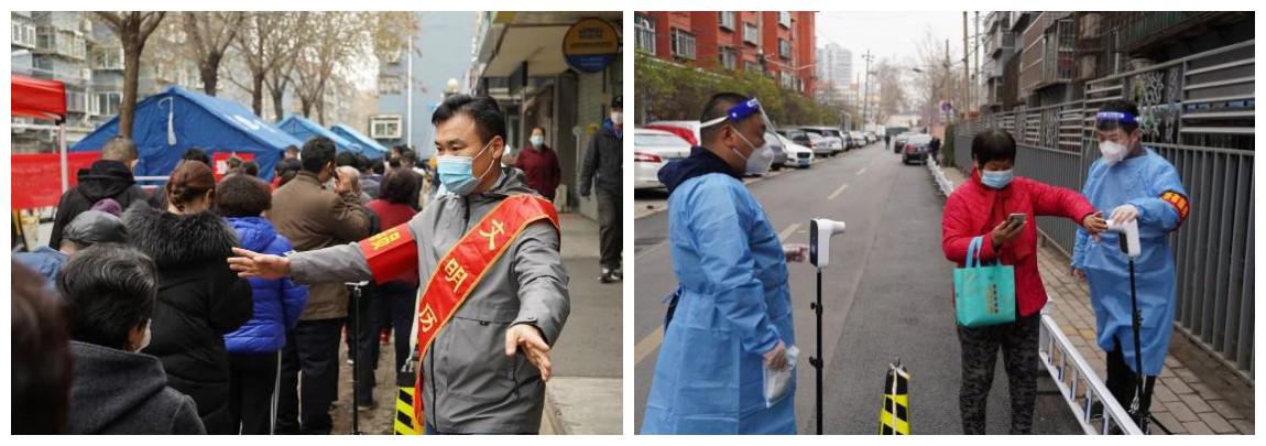 為確保安全、提高效率,志愿者們持續(xù)引導大家準備好身份證和“健康碼”,保持安全距離,全程佩戴口罩,檢測完畢立即離開。志愿者們?nèi)靾允貚徫?,為居民做好服務保障工作,以實際行動為群眾辦實事。領隊王新芳是一名退伍軍人,他身穿防護服忙前忙后,當天氣溫很低,身上早已濕透,他說,作為一名黨員和退伍軍人,時刻準備沖鋒在一線。