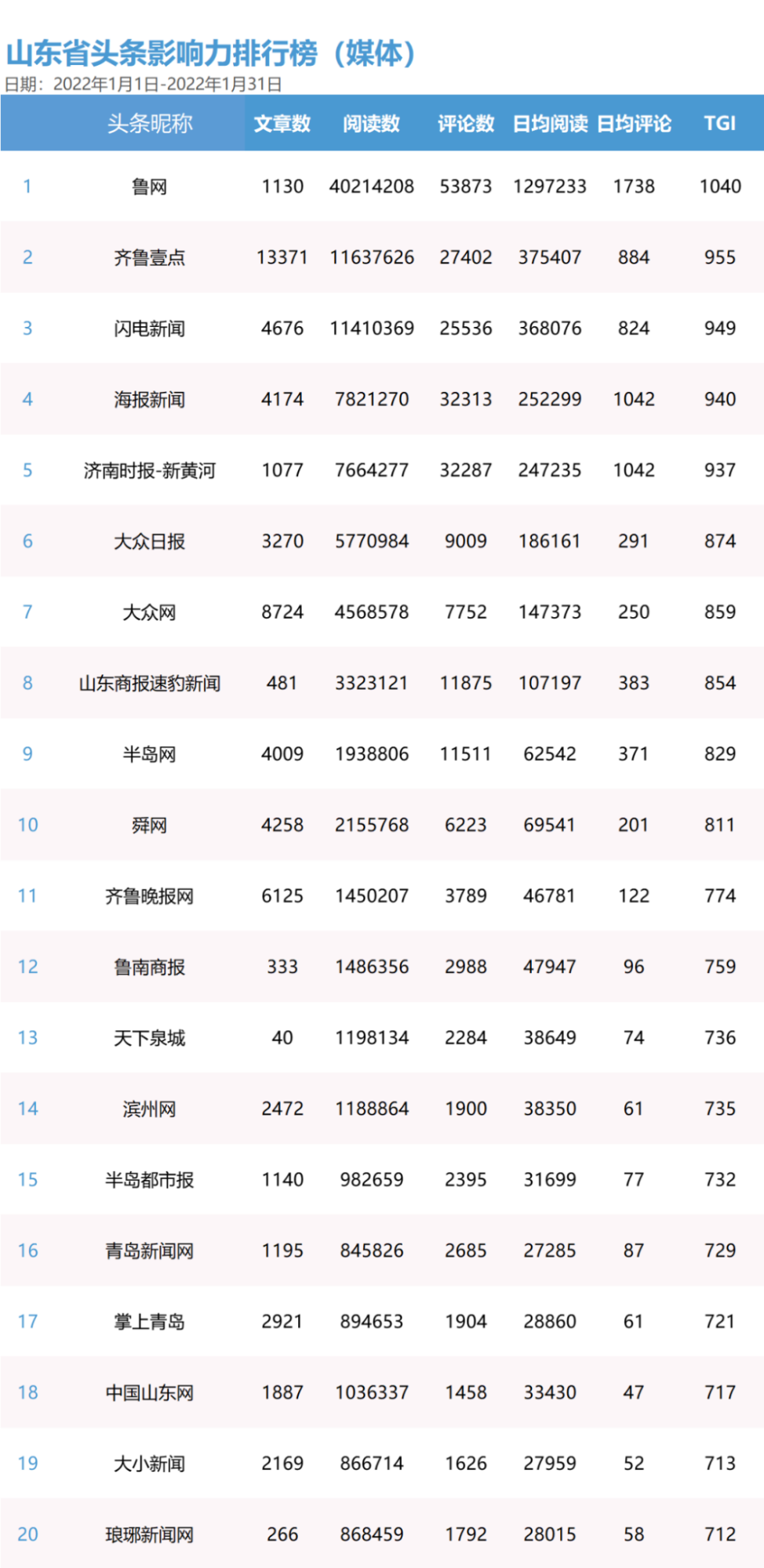 在此前發(fā)布的1月份山東省頭條影響力排行榜(媒體)中,“魯網(wǎng)”均篇傳播效果最佳,篇均閱讀量突破3萬,共獲得4021萬閱讀量、129萬日均閱讀量和5萬評論數(shù),超過榜單中其他媒體賬號,以1040的TGI值位列第一。