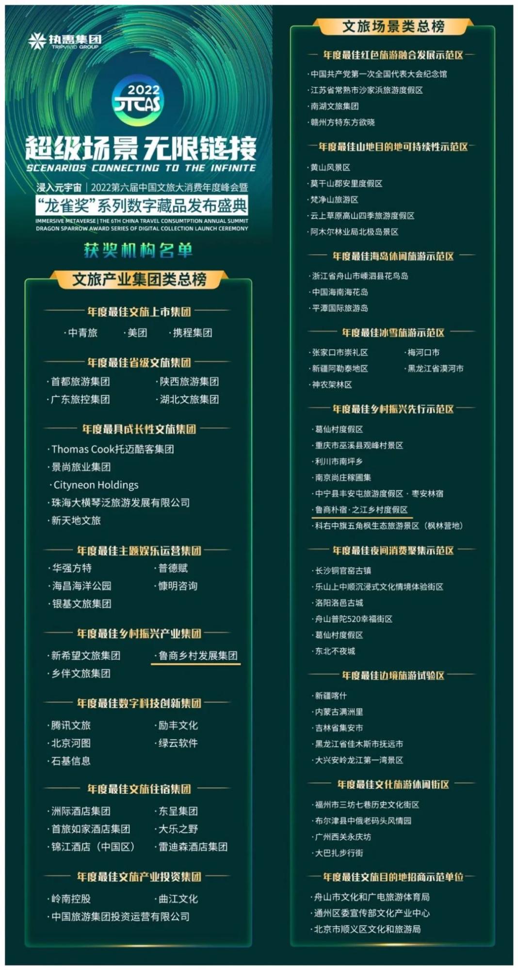 5月31日,第六屆中國文旅大消費年度峰會暨“龍雀獎”頒獎盛典舉辦。經(jīng)過激烈角逐,山鄉(xiāng)集團有限公司(原魯商鄉(xiāng)村發(fā)展集團)從眾多參選企業(yè)中脫穎而出斬獲“年度最佳鄉(xiāng)村振興產(chǎn)業(yè)集團”獎項。山鄉(xiāng)集團旗下杭州之江鄉(xiāng)村度假區(qū)榮獲“最佳鄉(xiāng)村振興先行示范區(qū)”稱號。