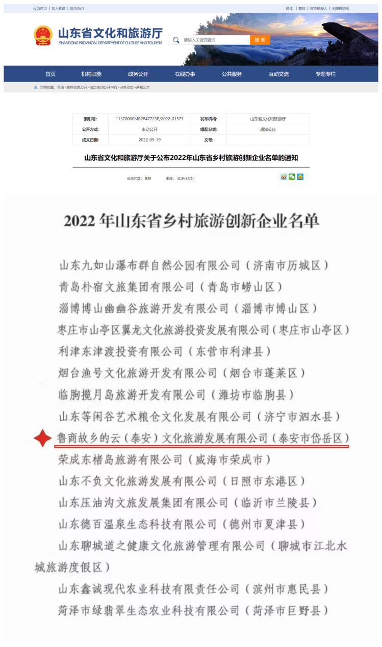 近日,省文化和旅游廳公布2022年山東省鄉(xiāng)村旅游創(chuàng)新企業(yè)名單,山鄉(xiāng)集團故鄉(xiāng)的云(泰安)文化旅游發(fā)展有限公司(簡稱“故鄉(xiāng)的云公司”)成功入選。