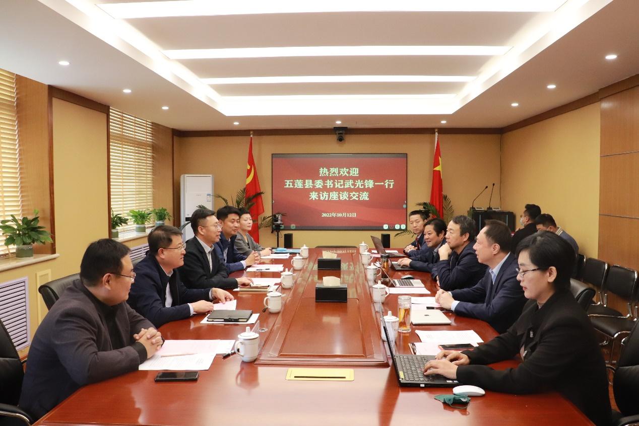 10月12日,五蓮縣委書記武光鋒一行到訪山東文旅集團,集團黨委書記、董事長高洪雷出席座談。