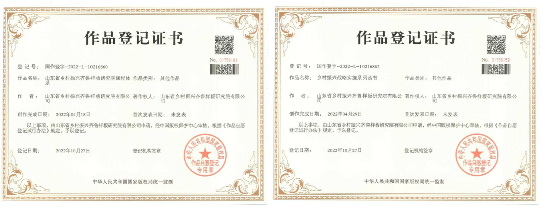 近日,山東省鄉(xiāng)村振興齊魯樣板研究院(簡稱“研究院”)《鄉(xiāng)村振興戰(zhàn)略系列叢書》《山東省鄉(xiāng)村振興齊魯樣板課程體系》獲得國家版權(quán)局頒發(fā)的著作權(quán)登記證書,《鄉(xiāng)村振興兩院一體“461”運(yùn)營體系》《鄉(xiāng)村振興項(xiàng)目申報(bào)服務(wù)體系》《鄉(xiāng)村振興利益聯(lián)結(jié)機(jī)制服務(wù)體系》《鄉(xiāng)村振興策劃規(guī)劃服務(wù)體系》等6項(xiàng)研究成果獲得國家版權(quán)局頒發(fā)的計(jì)算機(jī)軟件著作權(quán)登記證書。