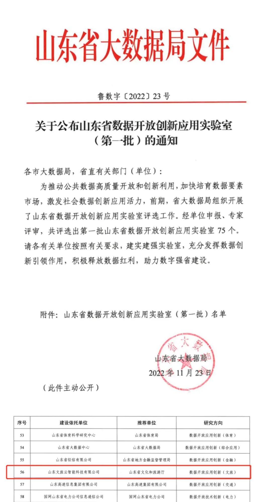 近日,山東省大數(shù)據(jù)局發(fā)布《關(guān)于公布山東省數(shù)據(jù)開放創(chuàng)新應(yīng)用實(shí)驗(yàn)室(第一批)的通知》,由山東文旅云智能科技有限公司(簡(jiǎn)稱“文旅云公司”)申報(bào)的“文旅大數(shù)據(jù)創(chuàng)新應(yīng)用實(shí)驗(yàn)室”入圍第一批山東省數(shù)據(jù)開放創(chuàng)新應(yīng)用實(shí)驗(yàn)室名單。