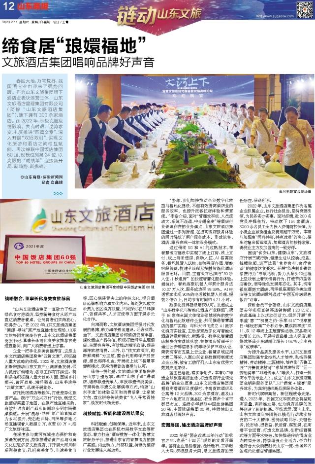 企業(yè)一把手化身美食推薦官,這是山東文旅酒店集團聚焦“四篇文章”,積極融入重大戰(zhàn)略的體現(xiàn)。2022年,文旅酒店集團聚焦推動山東文旅產(chǎn)業(yè)高質(zhì)量發(fā)展,努力抓好擴銷增效,各項工作有序推進。特別是在積極融入重大戰(zhàn)略方面,圍繞鄉(xiāng)村振興、黃河戰(zhàn)略、海洋強省、山東手造等“四篇文章”,迅速開展業(yè)務。