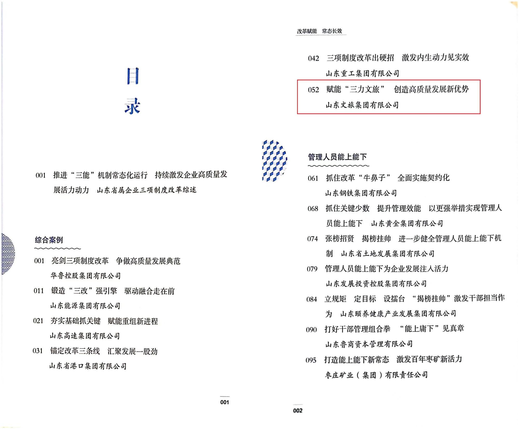 近日,山東省國資委黨委組織編寫出版了《改革賦能 常態(tài)長效——山東省屬企業(yè)三項制度改革探索與實踐》。本書收錄了省屬企業(yè)在推進三項制度改革中探索形成的典型經(jīng)驗做法,充分展現(xiàn)了省屬企業(yè)三項制度改革取得的豐碩成果。集團《賦能“三力文旅” 創(chuàng)造高質(zhì)量發(fā)展新優(yōu)勢》作為6家省屬企業(yè)之一,唯一一家委管企業(yè)入選綜合案例。此外,酒店集團《推進一控一管三輔助 助力企業(yè)逆境突圍》和山鄉(xiāng)集團《積極探索市場化選人用人機制 全力激發(fā)鄉(xiāng)村振興建設(shè)澎湃新動能》分別入選收入能增能減和員工能進能出專項案例。