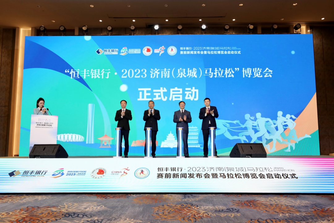 濟南市委宣傳部副部長、市政府新聞辦主任趙民,濟南市體育局黨組成員、副局長趙晨光,恒豐銀行黨委委員、副行長,濟南分行黨委書記、行長白雨石,山東文旅集團黨委書記、董事長丁藝,共同啟動恒豐銀行·2023濟南(泉城)馬拉松博覽會。