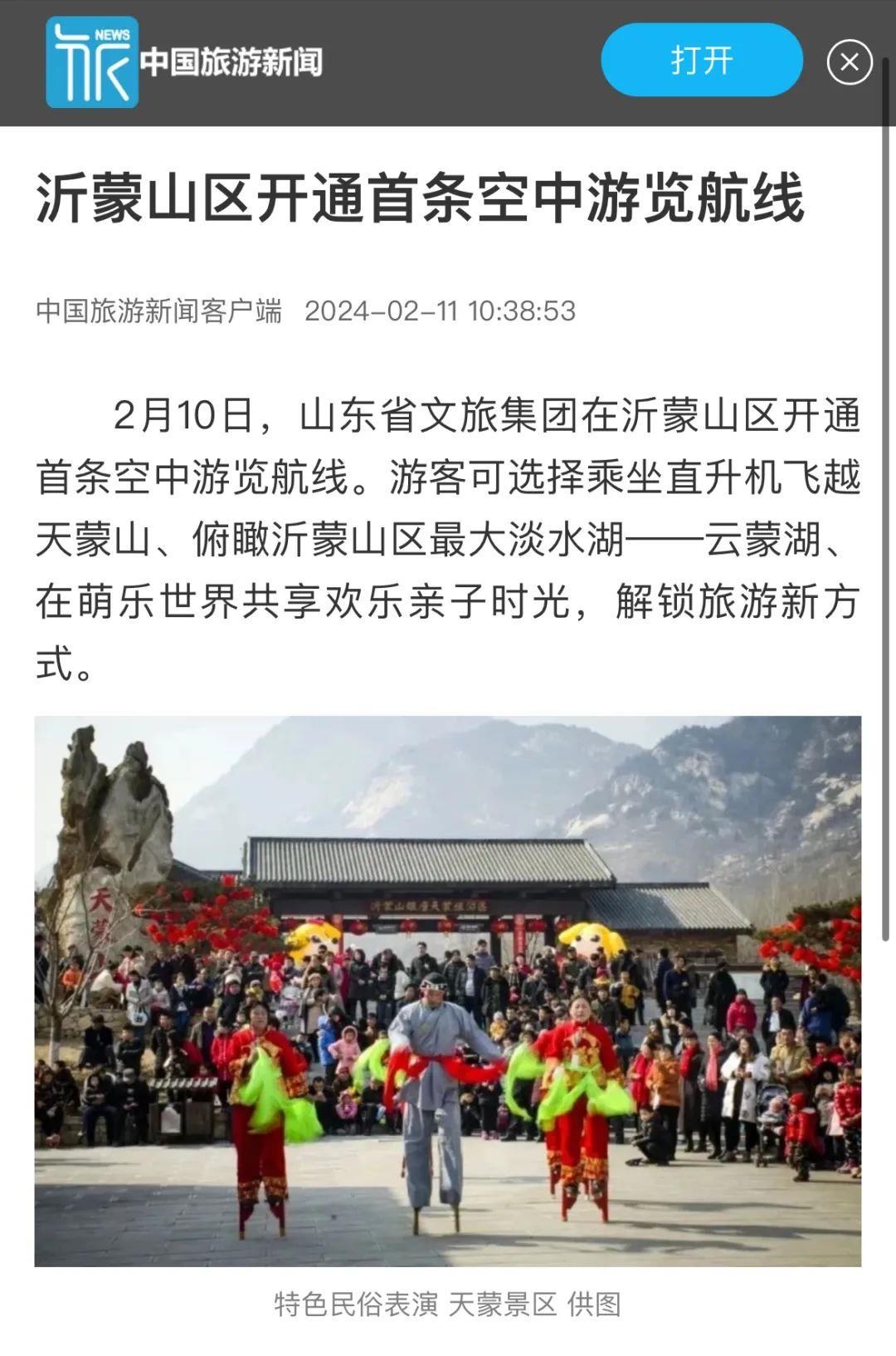 春節(jié)假期,天蒙景區(qū)聯(lián)合云蒙明珠景區(qū)、萌樂世界旅游區(qū)共同推出“飛天享云瞰萌樂”直升機飛行體驗,活動連續(xù)被新華網(wǎng)、光明網(wǎng)、中國旅游報等20余家媒體報道。