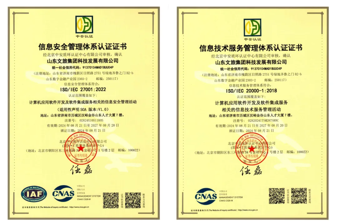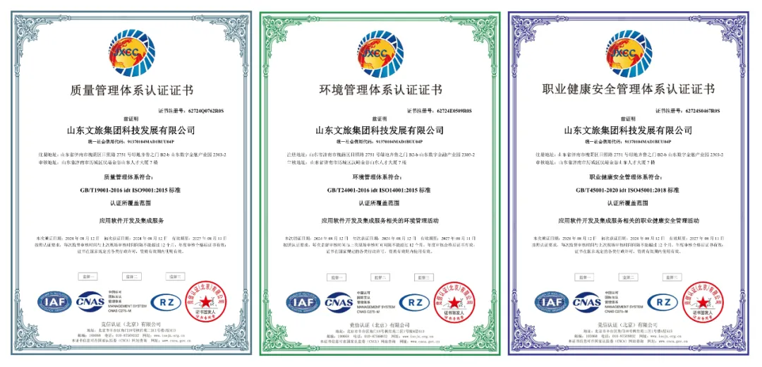 近期,為推進(jìn)業(yè)務(wù)規(guī)范化管理,提升公司市場拓展能力,文旅科技公司通過了由國際標(biāo)準(zhǔn)化組織(ISO)制定的五項管理體系認(rèn)證。其中包括,作為企業(yè)管理現(xiàn)代化重要標(biāo)志的ISO9001質(zhì)量管理體系、ISO14001環(huán)境管理體系、ISO45001職業(yè)健康安全管理體系等三項體系,以及信息軟件開發(fā)行業(yè)必備的ISO20000信息技術(shù)服務(wù)管理體系認(rèn)證、ISO27001信息安全管理體系認(rèn)證等兩項體系。