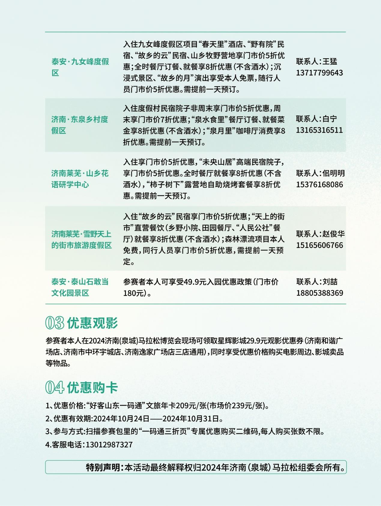 據(jù)了解,此次推出的山東文旅集團特惠權(quán)益卡涵蓋住、游、娛、購等方方面面,2024年10月27至12月31日活動期間,2024年濟南(泉城)馬拉松參賽選手憑參賽號碼簿及個人身份證可在山東文旅集團旗下酒店、景區(qū)、影城等享受多重優(yōu)惠,亮點多多,福利滿滿。