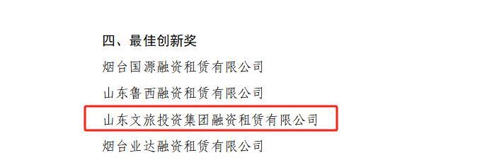 近日,山東省融資租賃行業(yè)協(xié)會舉辦了2024年全省融資租賃行業(yè)有關(guān)獎(jiǎng)項(xiàng)評選活動(dòng)。在省地方金融管理局的指導(dǎo)下,經(jīng)過專家評審,山東文旅投資集團(tuán)融資租賃有限公司(以下簡稱“文旅租賃”)獲評“最佳創(chuàng)新獎(jiǎng)”,成為全省四家獲此殊榮的公司之一。