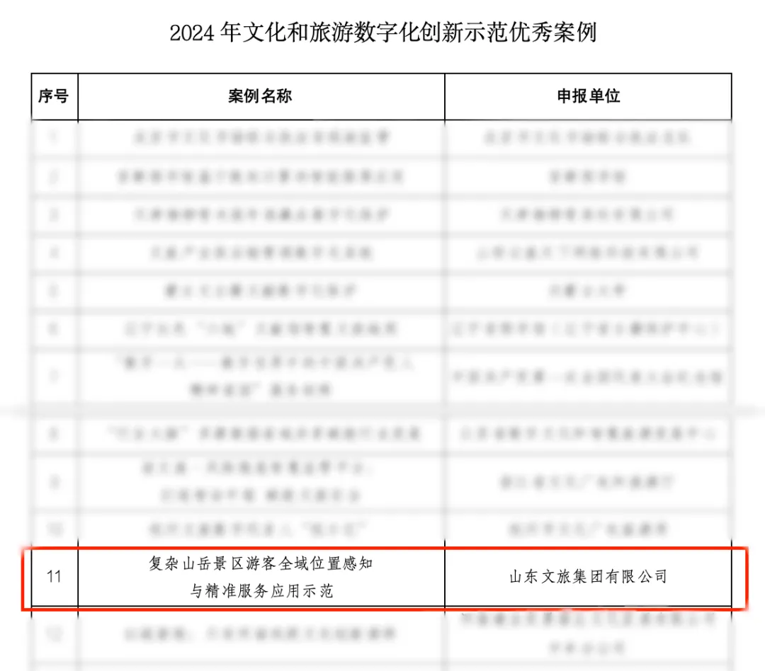 近日,文化和旅游部公布2024年文化和旅游數(shù)字化創(chuàng)新示范“十佳案例”和“優(yōu)秀案例”,山東文旅集團(tuán)參評(píng)的“復(fù)雜山岳景區(qū)游客全域位置感知與精準(zhǔn)服務(wù)應(yīng)用示范”項(xiàng)目入選“優(yōu)秀案例”,為山東省唯一入選案例。
