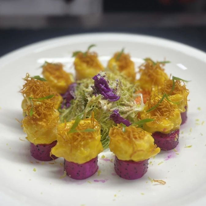 怡豪大飯店彩虹色系的“五彩撈汁拌蜇頭”,搭配油醋汁,輕盈零負(fù)擔(dān)。臨沂鉑爾曼大酒店“芝麻菜腰果果蔬沙拉”,以火龍果花束造型驚艷亮相。菏澤頤庭華美達酒店輕脂改良版的“清燉鮰魚獅子頭”,用魚肉替代豬肉更健康。淄博華美達大酒店的“輕脂四鮮翡翠炒”,蝦仁邂逅荷蘭豆,橄欖油快炒保留脆嫩清香。